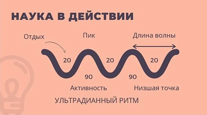 3. Учите команду правильно отдыхать. Все мы биологические существа. Хотим мы этого или нет, но работать, как роботы, без перерыва и с одинаковой производительностью мы не умеем. Мы подчинены ультрадианным ритмам: пики активности – 90-120 минут, потом спад 10-20 минут. Необходимо научиться подстраивать работу под жизненные биоритмы: распределять ее на блоки и планировать перерывы. Правильно отдыхать тоже нужно учиться: не запивать усталость кофе, не просто менять свою деятельность с разбора почты на работу в другой программе. Важно отвлечь свой мозг, обновиться, перезарядиться. Если мы игнорируем перерывы, к 15-16 часам мы чувствуем усталость, которая не позволяет продуктивно работать остаток дня.