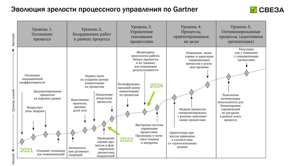 Топ-менеджеры любят чёткие дорожные карты, на которых видно, где мы сейчас, куда движемся и какие KPI у процесса. Сначала мы проводим диагностику зрелости бизнес-процессов. Не каждый процесс нужно доводить до идеала: например, разовую проверку раз в пять лет нет смысла глубоко оптимизировать.