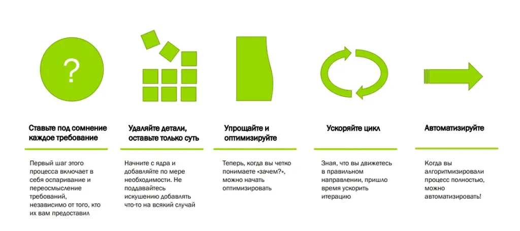 Во-вторых, мы безжалостно удаляем всё лишнее, оставляя лишь суть, что сокращает путь от задумки руководителя до результата для клиента. Всё, что можно упростить, – мы упрощаем. Всё, что можно оптимизировать и ускорить, – мы ускоряем, чтобы генерировать дополнительную прибыль.
