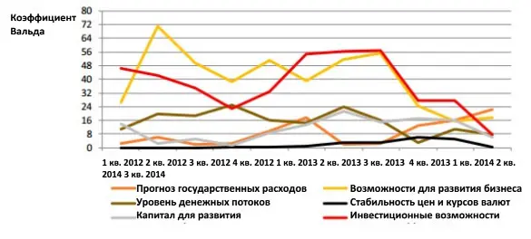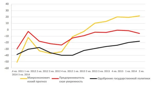Темпы укрепления потенциала предприятий в 3 квартале замедлились после 6 месяцев стремительного роста. Вызывает беспокойство тот факт, что волатильность цен и курсов валют снова увеличилась; таким образом, на протяжении целого года ситуация становится все более нестабильной. С учетом поправок на изменения фундаментальных показателей и состава выборки GECS, очевидно, что в реальном секторе экономики (среди МСП и крупных корпораций) в 3 квартале 2014 г. произошло значительное снижение уровня предпринимательской уверенности.