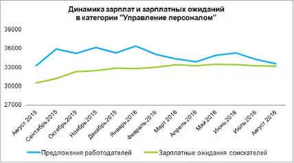 В августе 2016 года средняя заработная плата в разделе «Вакансии» подкатегории «Управление персоналом» составила 33,6 тысячи рублей – на 0,9% больше, чем годом ранее. При этом зарплатные ожидания соискателей находятся на этом же уровне и не превышают 33,2 тысячи рублей. В прошлом году этот показатель был на 8,9% ниже и составлял 30,5 тысячи рублей по информации, указанной в резюме.