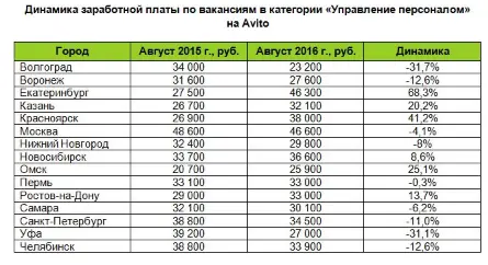 Минимальные ставки (23,2 тысячи рублей) предлагают работодатели из Волгограда, где уровень материальной компенсации снизился на 31,7% за год. Заметная отрицательная динамика зафиксирована и в Уфе: в августе 2016 года специалисты в области управления персоналом из башкирской столицы могли рассчитывать на 27 тысяч рублей против 39,2 тысячи годом ранее. Понижение ставок, но не столь значительное, характерно также для Воронежа, Нижнего Новгорода, Самары, Санкт-Петербурга и Челябинска, а средняя заработная плата пермских HR-специалистов осталась на уровне прошлого года.