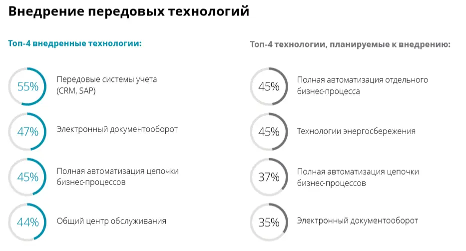 Согласно исследованию консалтинговой фирмы «Делойт», 17% российских химкомпаний не хватает специалистов в области автоматизации и оптимизации, 36% заявили о готовности инвестировать в технологии, чтобы автоматизировать процесс управления персоналом. В целом же инструменты Индустрии 4.0 пока что нужны в отечественном бизнесе преимущественно для внутренних целей.