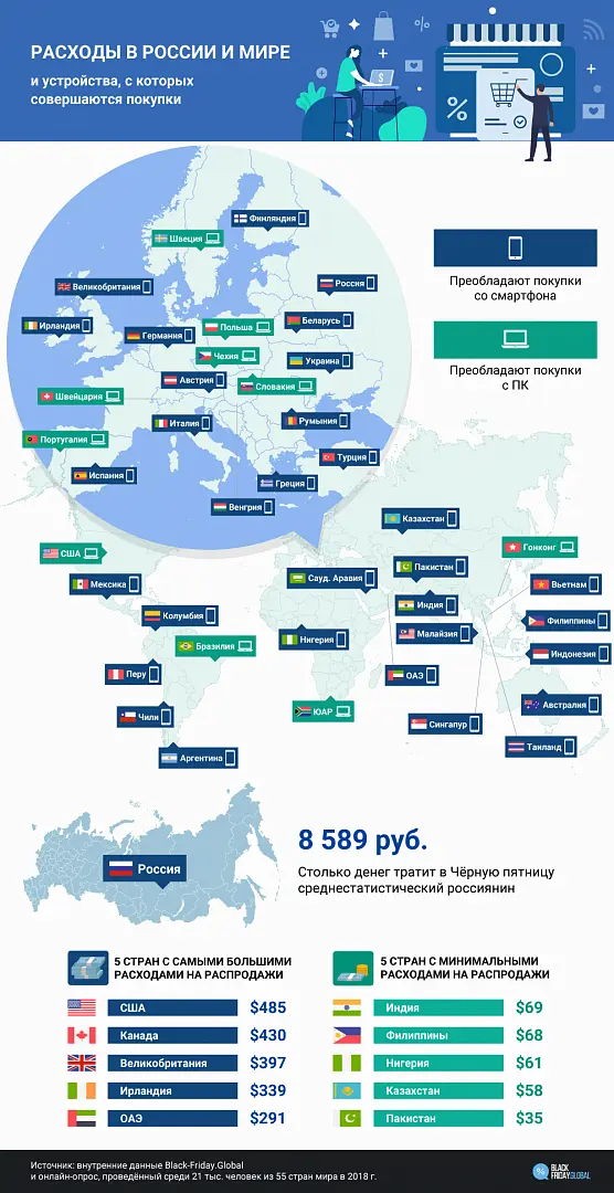 Как показывают итоги рунета за 2018 год, в интернет россияне чаще всего выходят со смартфона. Данные Black-Friday.Global также показывают, что мобильная аудитория в России гораздо охотнее совершает онлайн-покупки в «черную пятницу».