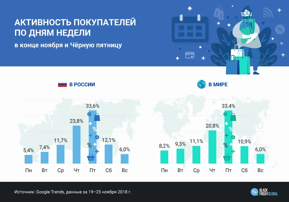 Данные Google Trends показывают, что одна треть (34%) всех недельных интернет-запросов, связанных с Black Friday в России, приходится именно на пятницу, хотя заинтересованность распродажей постепенно растет уже с понедельника. На четверг приходится 24% запросов этой недели, что тоже является довольно высоким показателем. К воскресенью активность падает до уровня понедельника. Эта тенденция свойственна не только России.