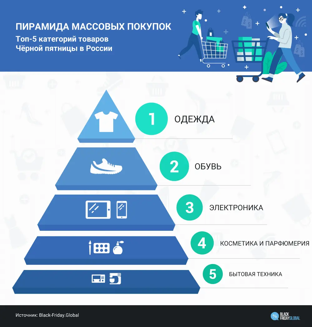 Статистика последних лет показывает, что в России в первую пятерку входят следующие категории: одежда, обувь, электроника, косметика и парфюмерия, бытовая техника. Следом по популярности продаж идут товары для детей и спорттовары. Общемировая тенденция такова, что, действительно, самые покупаемые в «черную пятницу» товары – одежда и обувь (и вообще товары фэшн-индустрии).