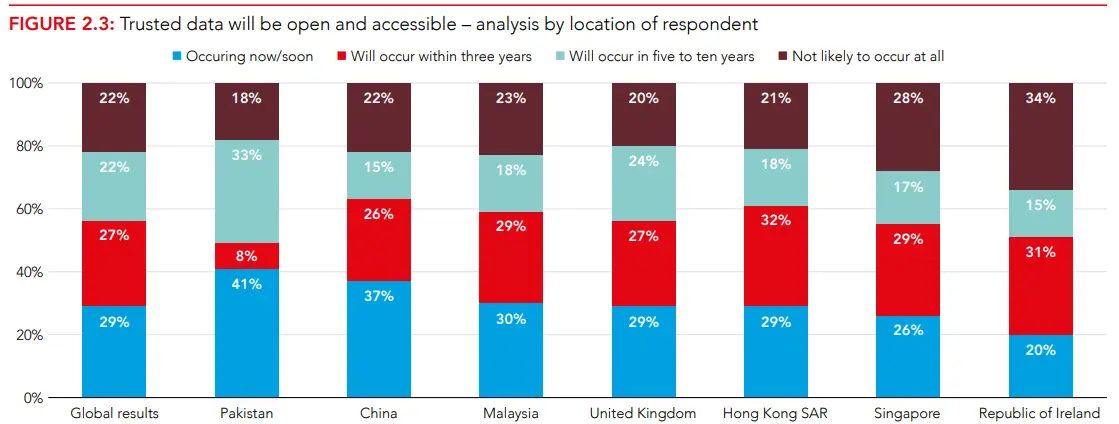 Почти треть (29%) респондентов считают, что надежные и открытые данные уже и так доступны в масштабах всей организации, а 22% считают, что гипотеза все еще не применима и ожидать ее воплощения на практике, по крайней мере, в течение 5-10 лет не стоит.