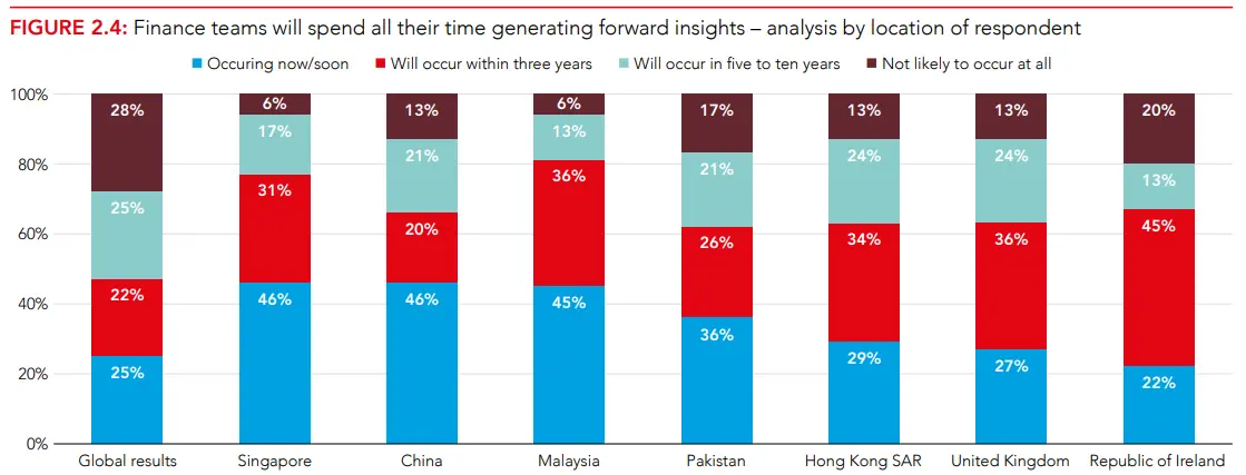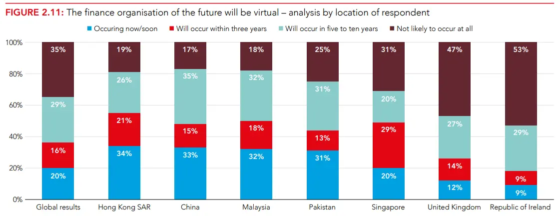 Многие организации согласились с тем, что финансовые компетенции все чаще выходят за рамки традиционных финансовых отделов и распространяются на всю организацию, но 35% респондентов полагают, что таких изменений не произойдет в ближайшие пять-десять лет.