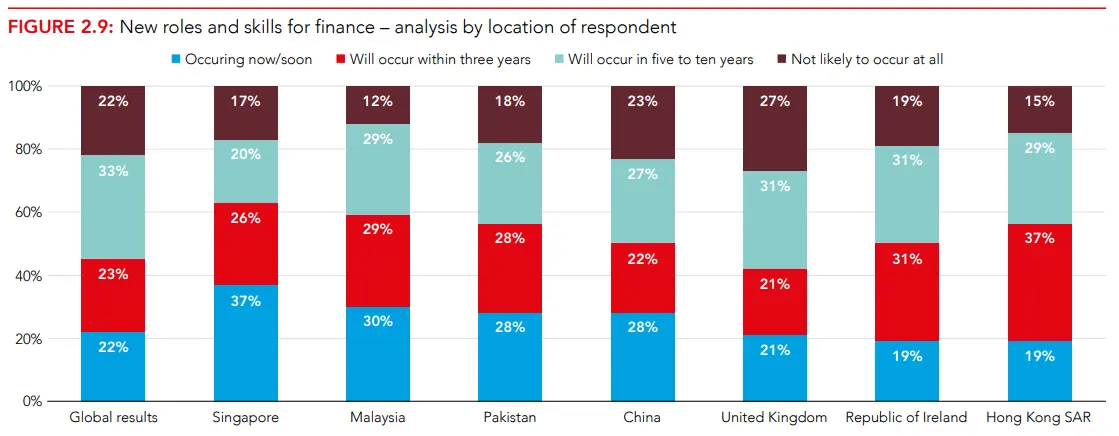 Респонденты сообщили, что процесс формирования новых ролей и навыков для оказания поддержки в финансовом сообществе идет медленнее, чем ожидалось: 22% считают, что это достигнуто уже сейчас, еще 46% считают, что это будет достигнуто через пять-десять лет.