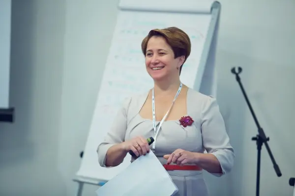 Первой выступила Татьяна Антипова, руководитель филиала центра поддержки бизнеса «Нестле», с докладом «Варианты снижения расходов компании, работающих с ОЦО, через оптимизацию