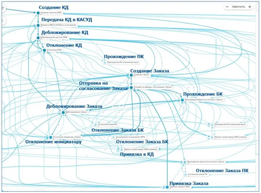 На схеме отчетливо видна сложная сеть, выявляющая проблемные зоны, где требуются улучшения. Это своего рода «слепок» текущего состояния, полученный в режиме онлайн. Это лишь один из примеров, но такой подход можно применить к любому процессу.