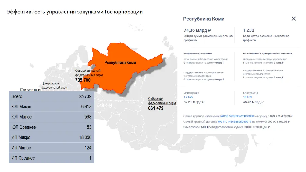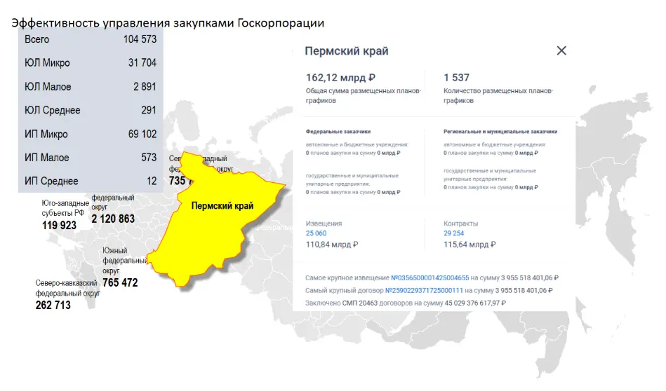 Красноярский край, обладающий богатыми ресурсами (лес, вода и другие природные богатства), демонстрирует следующие показатели: 114 тысяч предприятий, ИП Микро – 73 307, ИП среднее – 14. Объём закупок у этих предприятий в рамках 223-ФЗ составляет 330 миллиардов рублей – это официальные статистические данные.