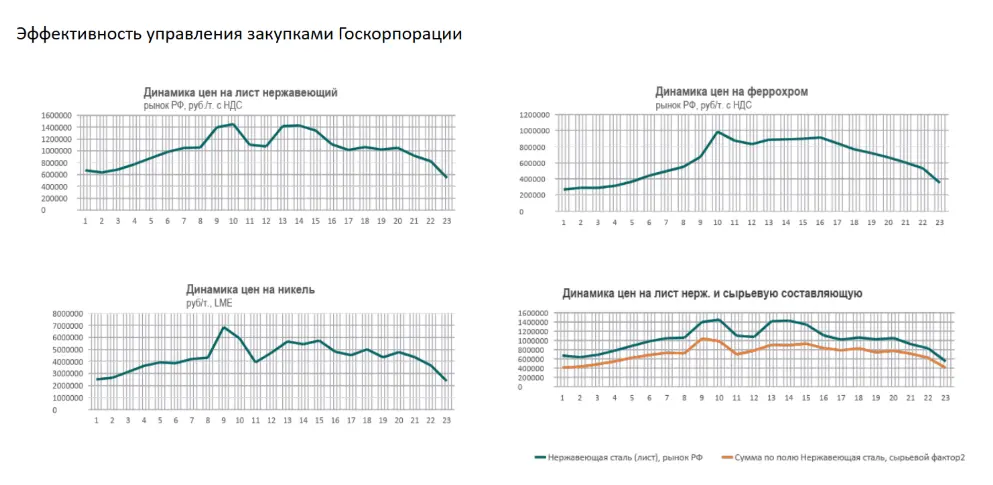 Приведенный анализ показывает тревожные тенденции. Согласно данным Металлторга, наблюдается падающая динамика цен на основные виды материалов, используемых при производстве оборудования для атомных электростанций. Особенно заметное снижение началось в 2023 году.