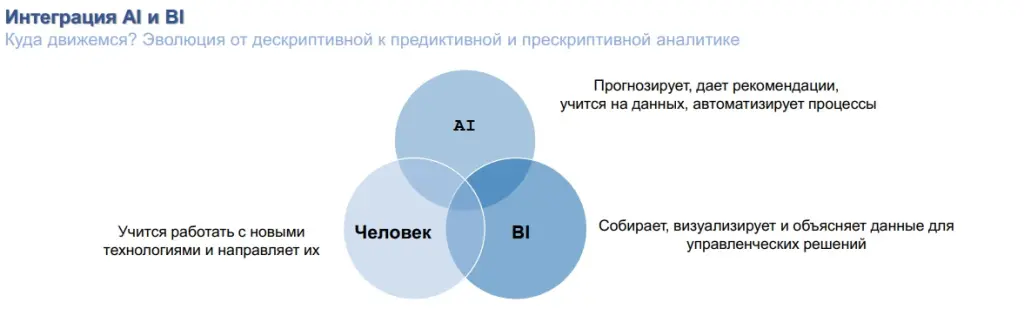 Одна из возможных ветвей дальнейшего развития – это симбиоз BI и AI. Системы, которые не просто показывают цифры, а анализируют тысячи показателей и сами предлагают инсайты: указывают на аномалии, выявляют скрытые взаимосвязи, помогают увидеть то, что легко упустить в массиве данных. В мире, где информации больше, чем человеческих ресурсов для её анализа, такой интеллектуальный помощник становится не роскошью, а необходимостью.