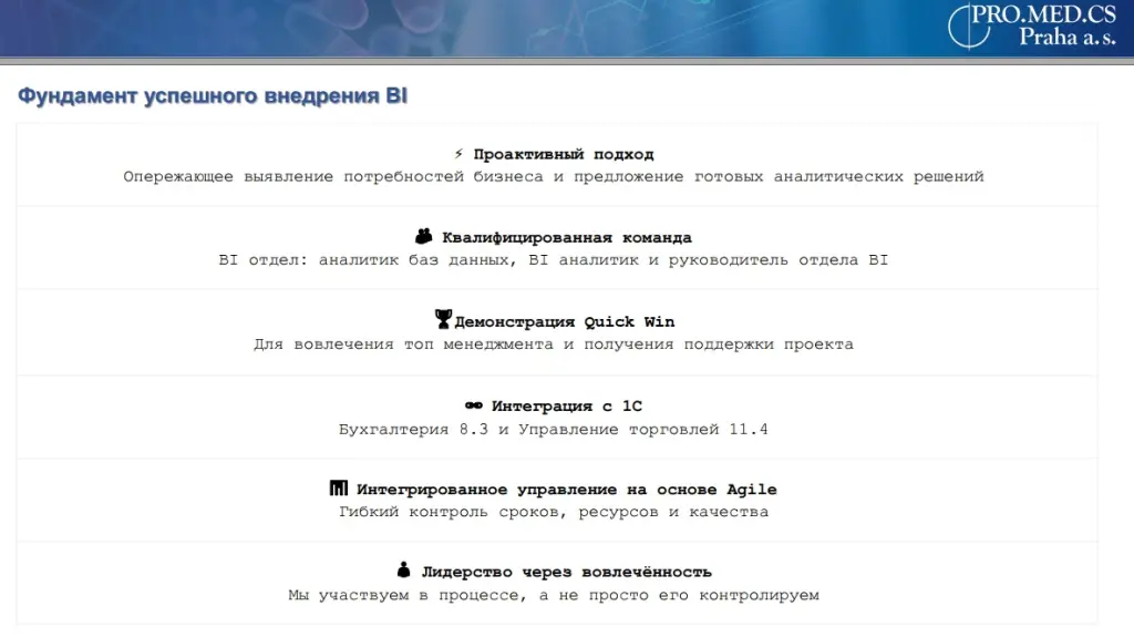 Квалифицированная команда. Наша команда BI невелика: руководитель и аналитик баз данных, совмещающие BI и 1С, и один полноценный BI-аналитик. Кроме того, бизнес-аналитик формулирует ТЗ для BI-отчётов, обеспечивая правильную интерпретацию данных. Их компетенции и вовлечённость бесценны. В таких проектах бесполезно пытаться «поднять» средних специалистов – нужно искать и удерживать лучших из лучших, создавая среду, где ценят не только ум, но и творческий подход. Особенно важно завоевать не просто лояльность, а сердца таких сотрудников, что в итоге окупается сторицей.