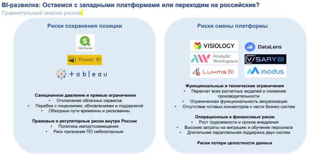 Сегодня мы стоим перед новым выбором, оценивая западные и отечественные BI-платформы с учётом санкционных и регуляторных рисков. Но наш взгляд направлен еще дальше – в будущее, где бизнес-аналитика всё теснее переплетается с искусственным интеллектом.