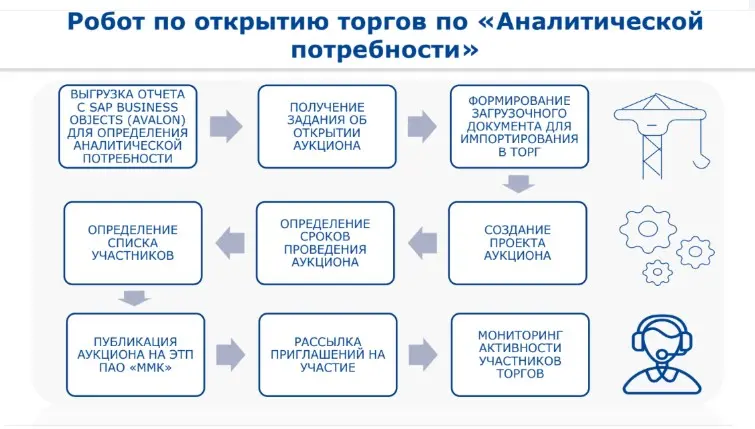 Сегодня только в коммерческой дирекции ММК функционирует около 40 роботов, причём роботизация охватывает все функциональные направления компании. В планах на 2026-й год– внедрение ещё 17 роботов. Основные сферы их применения включают формирование справочной информации, организацию торгов, автоматизацию ручных операций контроля, формирование договорных документов и взаимодействие с поставщиками.